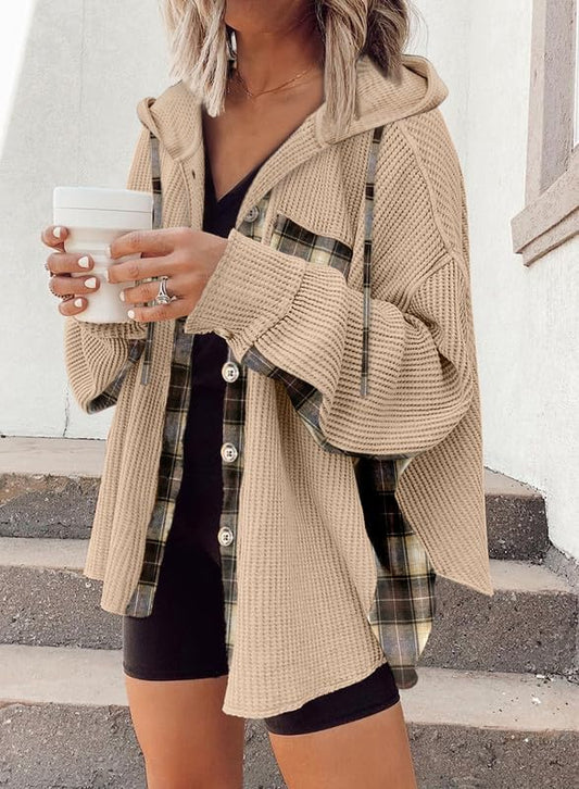 SHEWIN Womens Waffle Knit Plaid Shacket Boyfriend Button Down Shirt Hooded Jacket Loose Long Sleeve Tops