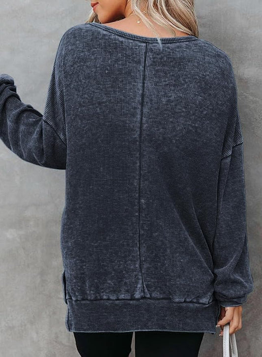 Dokotoo Womens Oversized Waffle Knit Crewneck Sweatshirts Long Sleeve Side Slits Casual Pullover Sweatshirt Tops