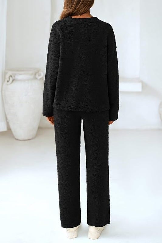 PRETTYGARDEN Women's 2 Piece Pullover Sweater Set Oversized V Neck Top Wide Leg Pants Fall Winter Fuzzy Lounge Outfit