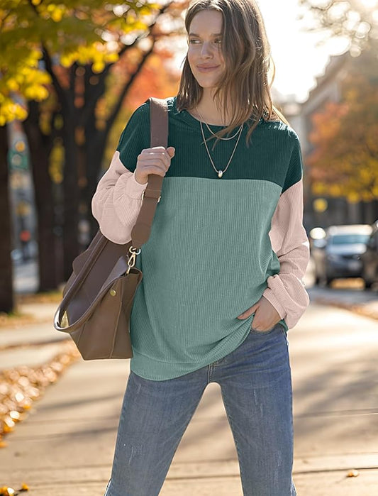 WIHOLL Womens Fashion 2024 Color Block Long Sleeve Crewneck Knitted Ribbed Shirts Tunic Tops Casual Loose