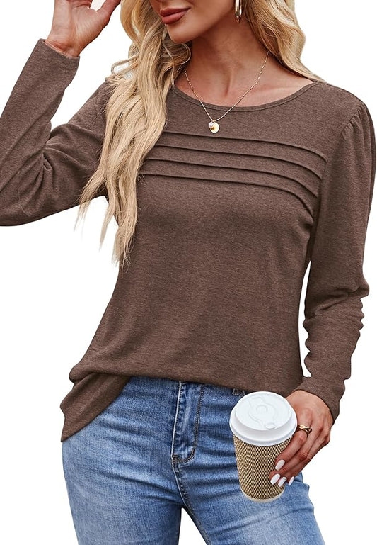 OFEEFAN Long Sleeve Shirts for Women Fall Fashion 2024 Dressy Casual Blouses Trendy Pleated Tunic Tops for Leggings